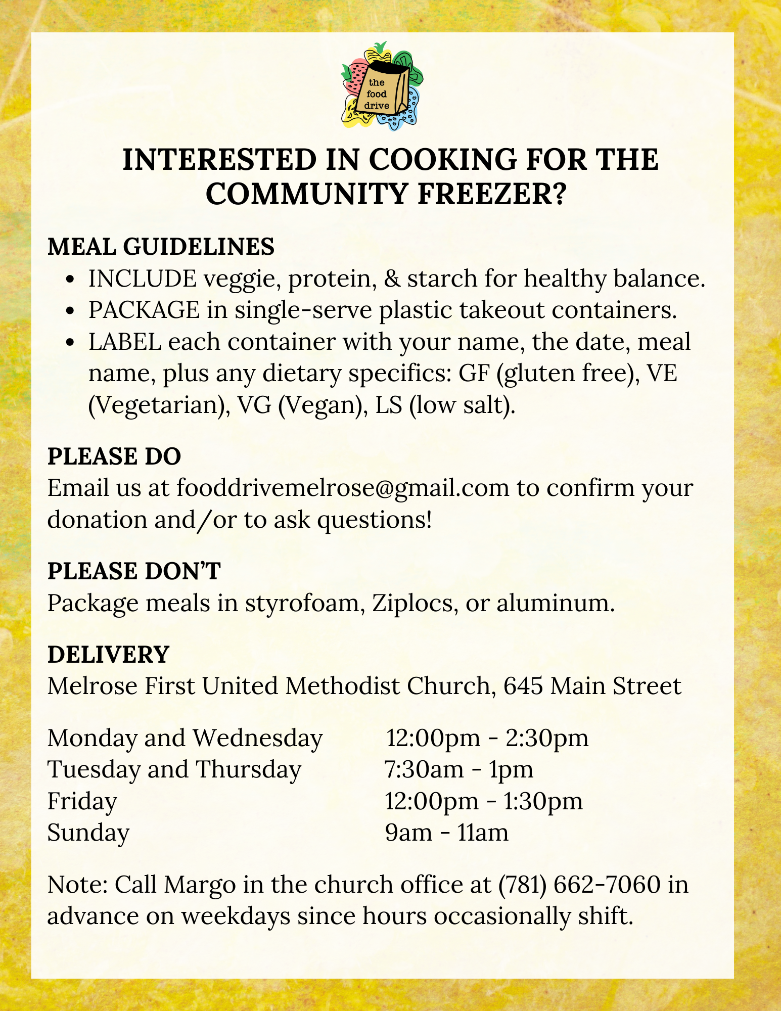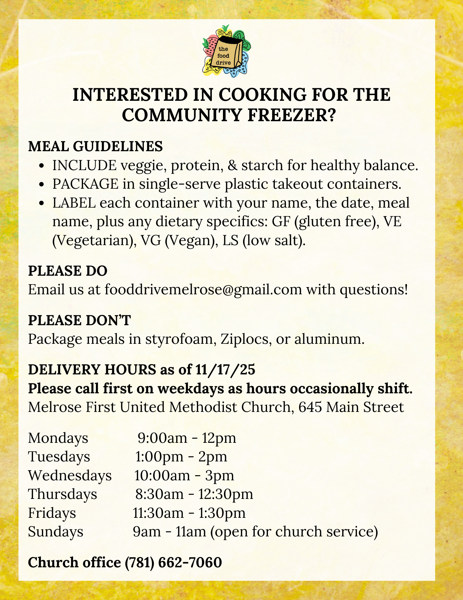 A partnership between First United Methodist Church of Melrose (FUMC) and The Food Drive, the Community Freezer program is held every Sunday from 11:30 AM to 12:00 PM at the church, which is centrally located at 645 Main Street in Melrose. The Melrose Community Freezer is housed at FUMC and stocked with individual and family-style meals by volunteer cooks, plus donations from local businesses BossMama Taproom & Grill, Buckalew’s General Store, Food rEvolution, Harrow’s Chicken Pies, The Kitchen Melrose, and Mama Jean.