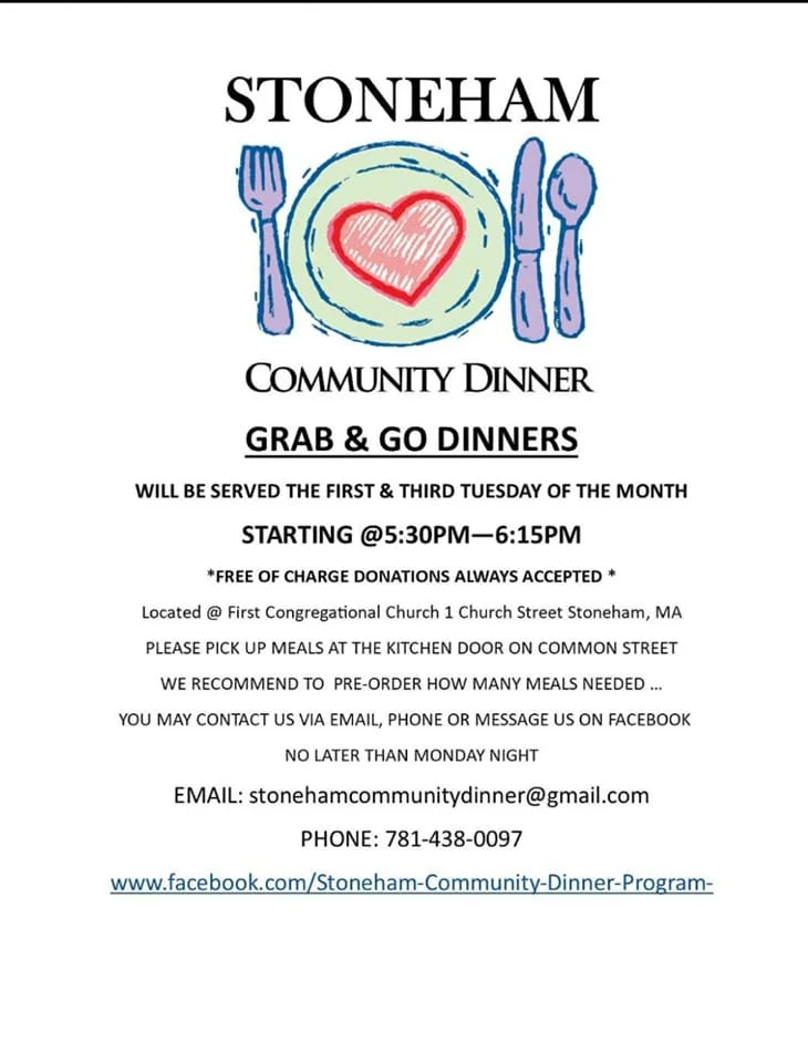 1 Church Street, Stoneham (NOTE: Call 781-438-0097 by the Monday prior to reserve a meal